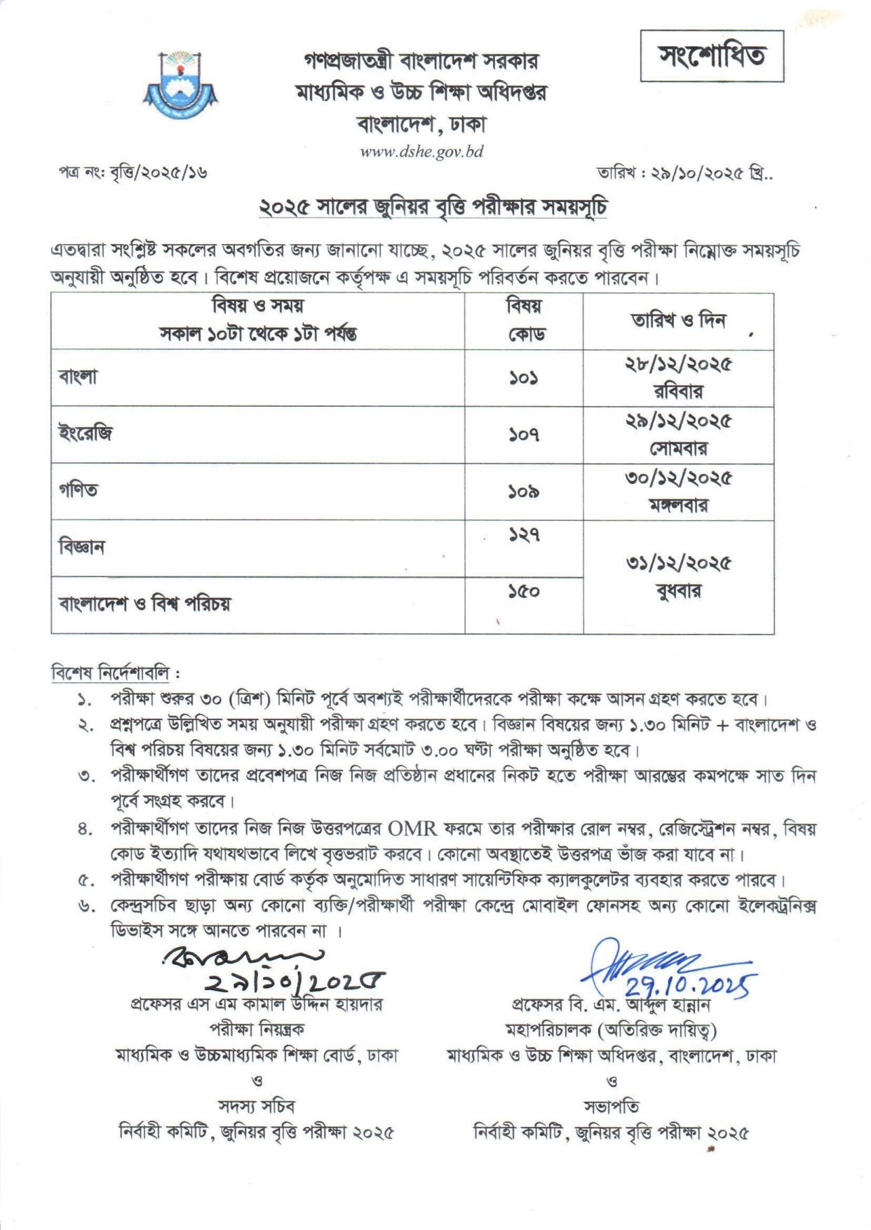 ২০২৫ সালের জুনিয়র বৃত্তি পরীক্ষার সময়সুচি।